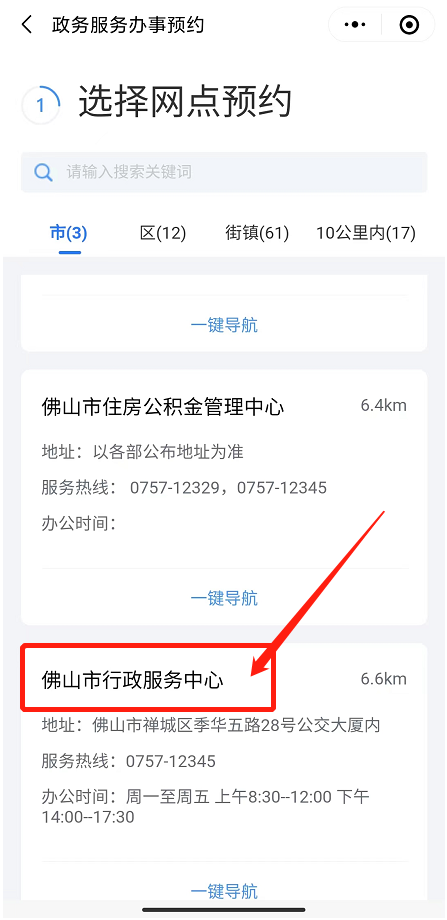 3、选择网点预约:可以所在地,选择【市】佛山市行政服务中心,或者选择【区】行政服务中心,还可以选择【镇街】网点办理。