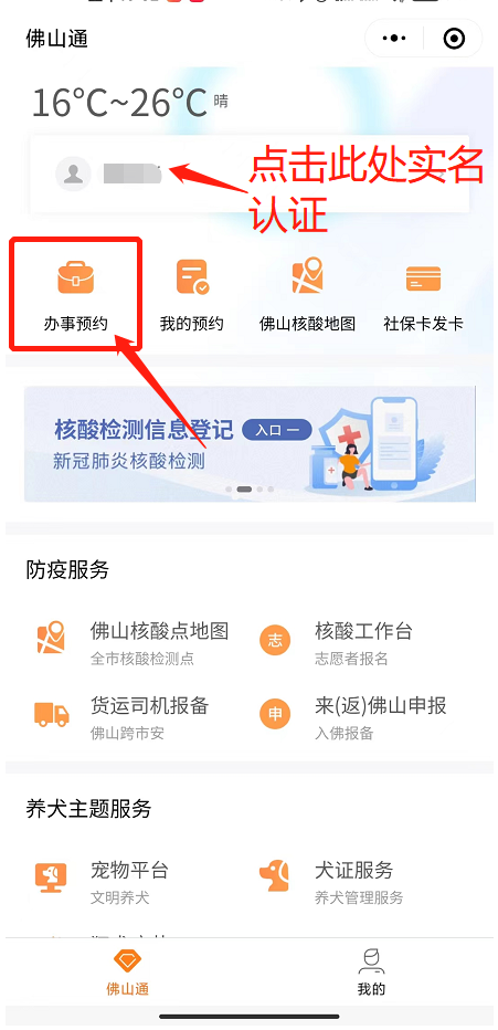 1、进入“佛山通”微信小程序,完成实名认证,首页点击【办事预约】。