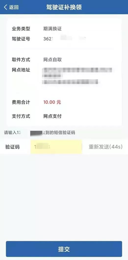 4、确认取件方式后,点击“下一步”,进入期满换证提交页面,再次确认所填信息无误后,获取手机短信验证码,通过验证,点击“提交”按钮,完成期满换证业务申请。