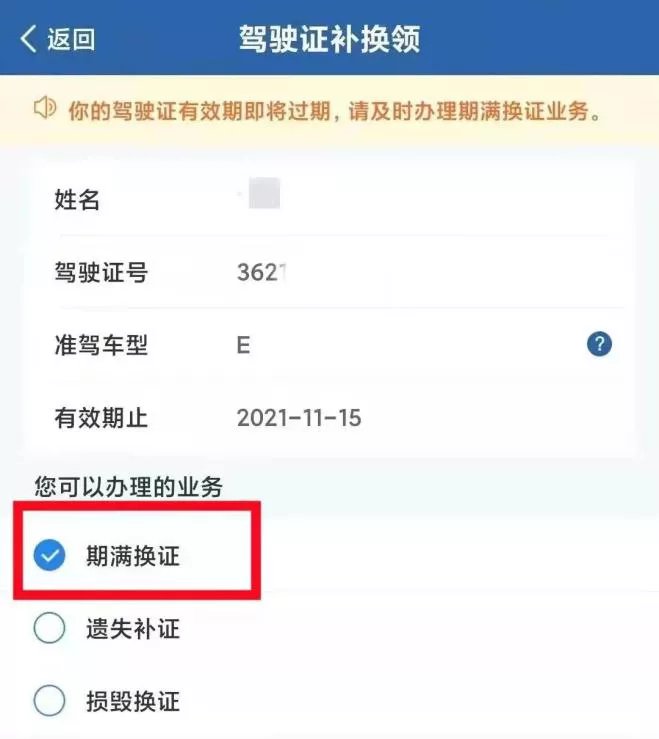 2、认真阅读期满换证业务须知后,勾选已认真阅读,确认用户申告内容,进入驾驶人信息确认页面,确认信息包括姓名、驾驶证号、有效日期等;