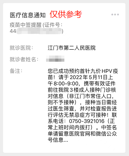 已在该院接种首针的居民,该院成人接种门诊会根据疫苗分配的数量、接种时间的先后顺序合理安排九价、四价疫苗第二、三针的接种时间(接种时间最长不会超过原定时间30天,一年内完成3剂次的接种不会影响疫苗的免疫效果),具体接种时间该院会以短信的形式通知各位居民。如超过30天仍未收到接种通知,可在正常工作日内拨打成人接种门诊联系电话:0750-3921016,核实接种情况。