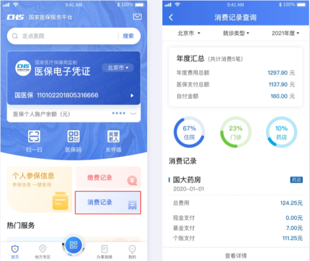 你还可以点击页面头部的筛选项,通过选择参保地、就诊类型和年度来筛选出你想要查询的消费记录明细。
