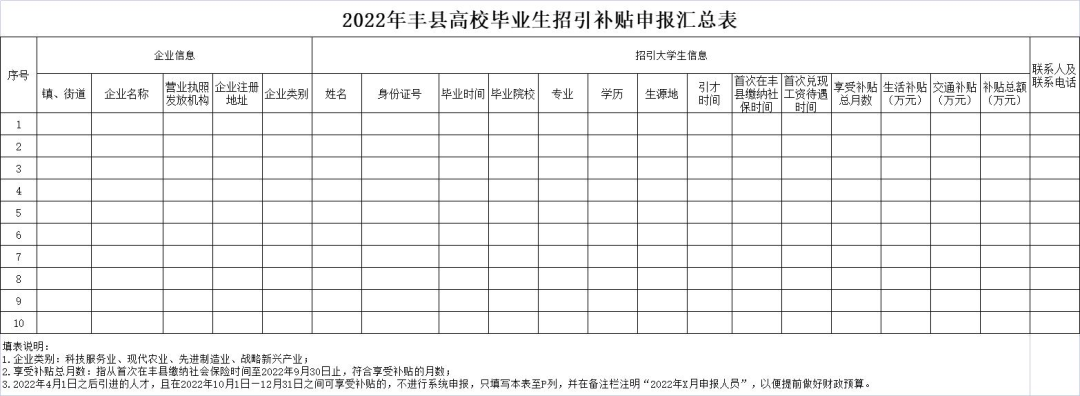 3、申请补贴。企业凭引进人才递交的英才卡复印件通过系统申请大学生招引补贴,同时填写《2022年丰县高校毕业生招引补贴申报汇总表》(见附件)发至邮箱fxrc@163.com。