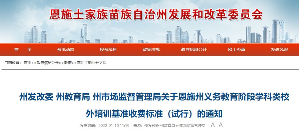 恩施州义务教育阶段学科类校外培训基准收费标准(试行)