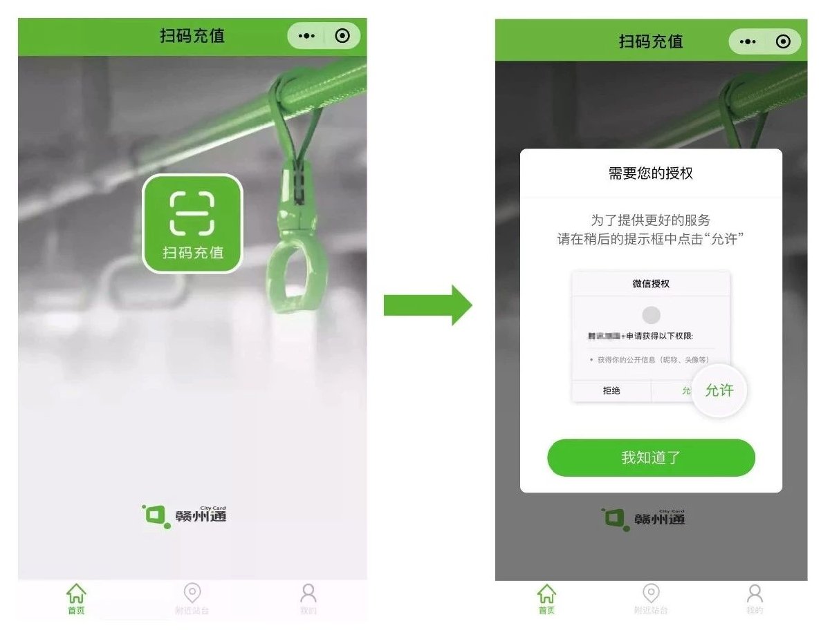 3、点击“扫码充值”,首次开通请“允许”服务授权。