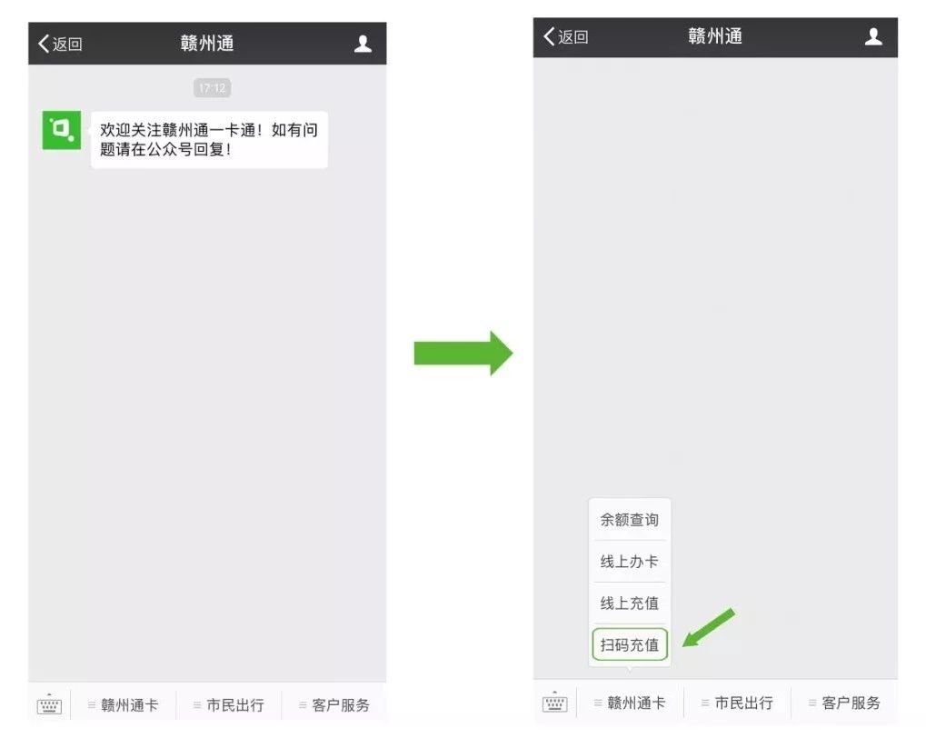 2、打开手机蓝牙,进入“赣州通”公众号,选择“赣州通卡”→“扫码充值”。(首次使用请先关注“赣州通”公众号)