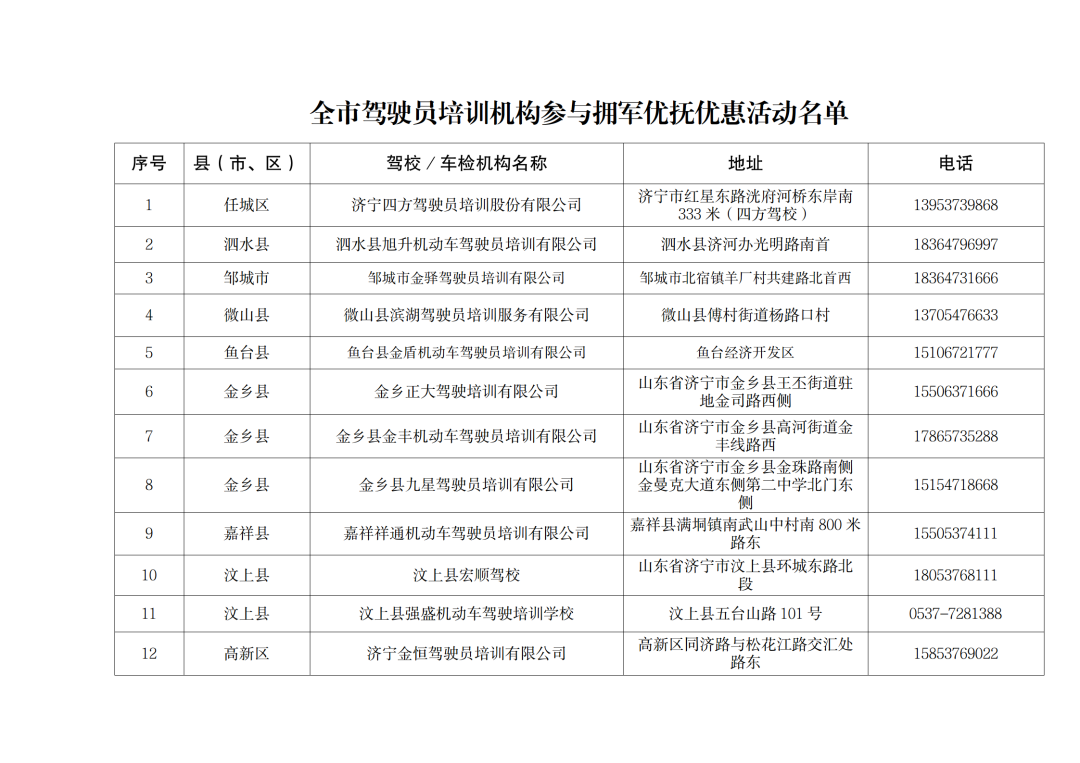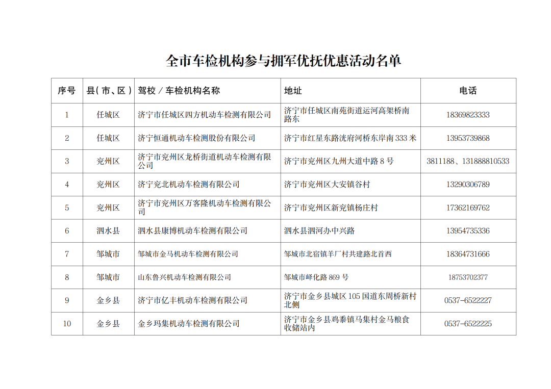 济宁全市驾培和车检机构参与拥军优抚优惠活动情况