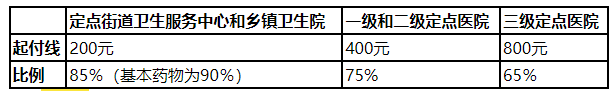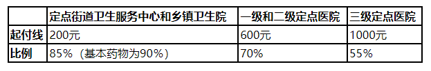 在实施基本药物制度的定点乡镇(街道)、村(社区)医疗机构就医,无起付标准。在其他门诊统筹定点医疗机构就医,起付标准为10元。