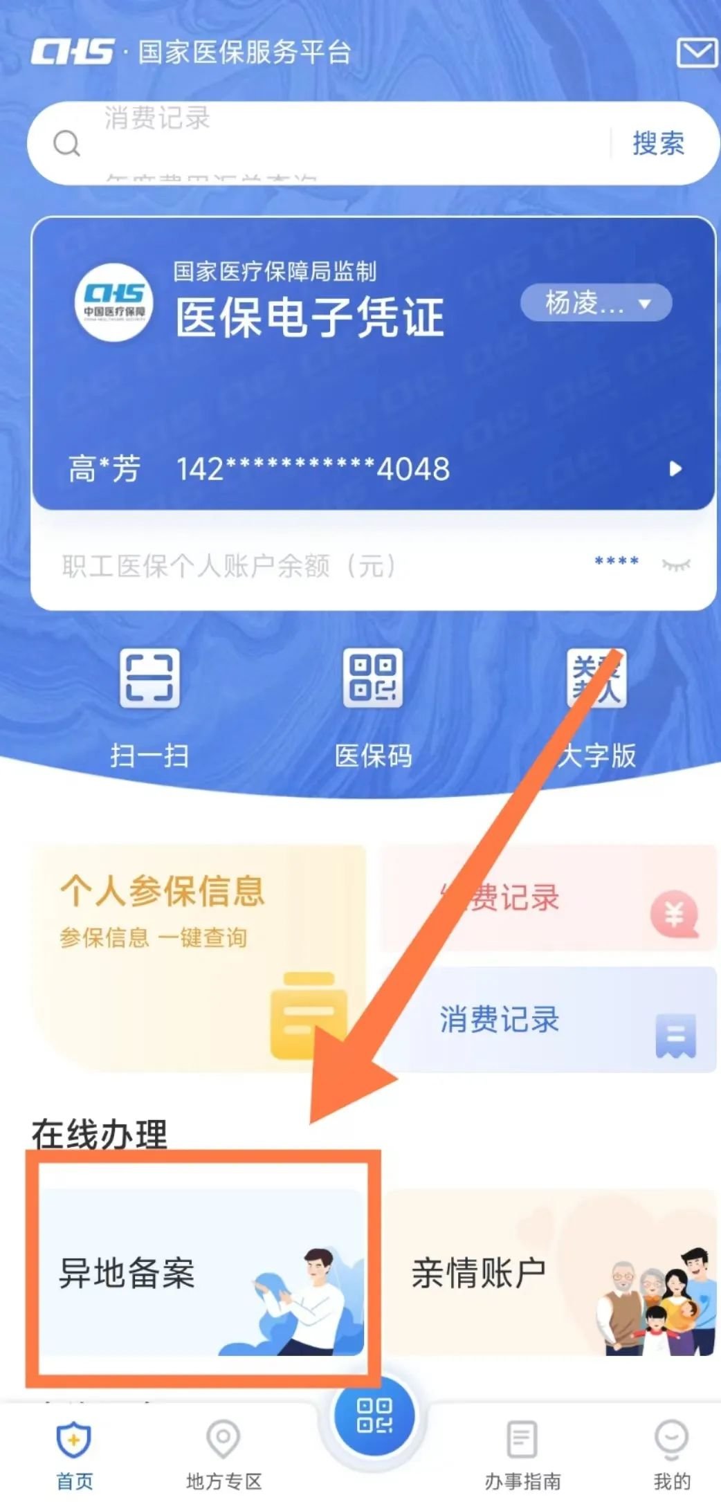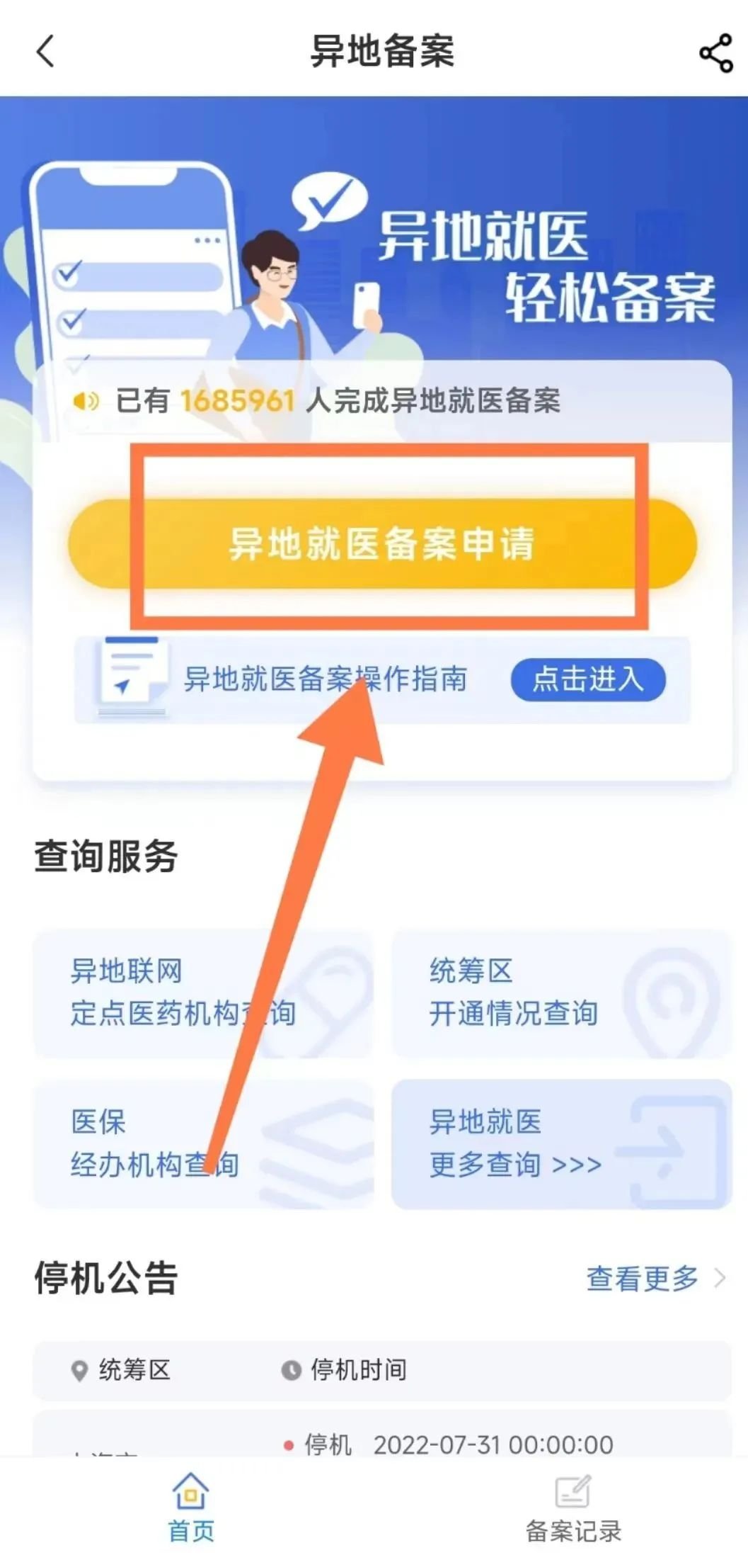 第一步:打开国家医保服务平台APP,依次点击首页【异地备案】-【异地就医备案申请】按钮,进入异地就医备案页面。