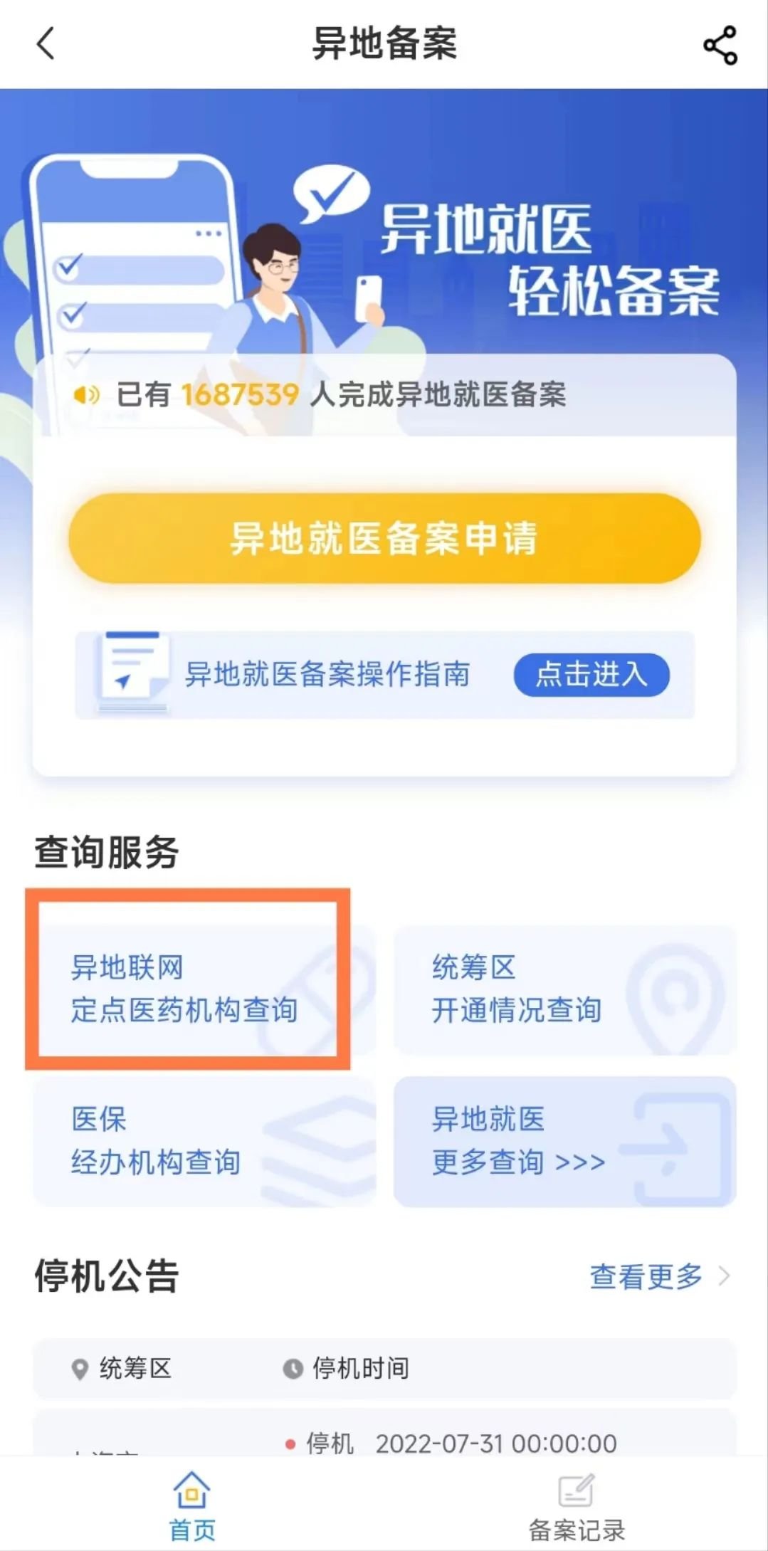 参保人在“异地就医”页面,可查询全国范围内已开通跨省住院费用直接结算的定点医疗机构和已开通跨省门诊费用直接结算的定点医疗机构。