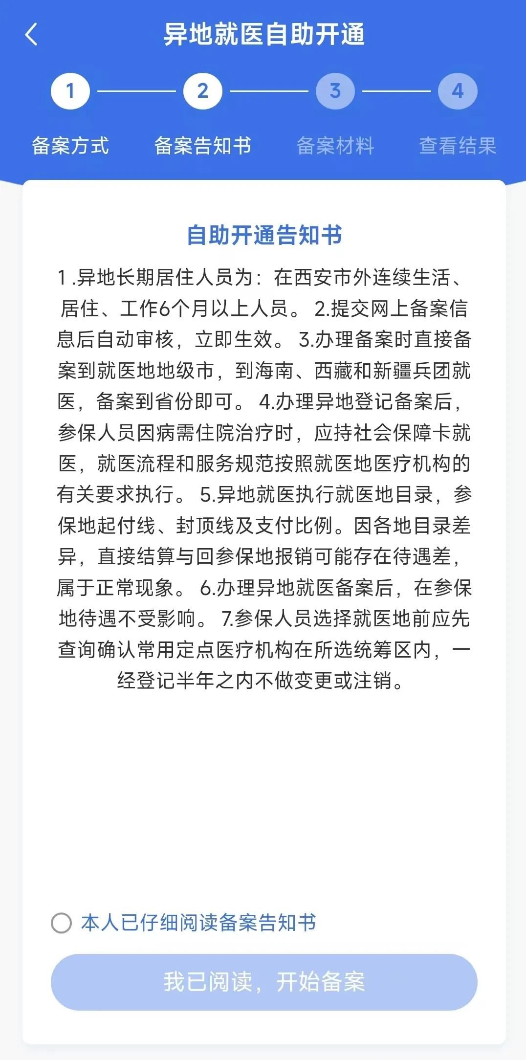 根据自己的实际情况,选择“参保地”、“就医地”、“参保险种”、“备案类型”后,点击【开始备案】按钮。