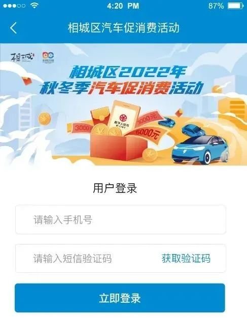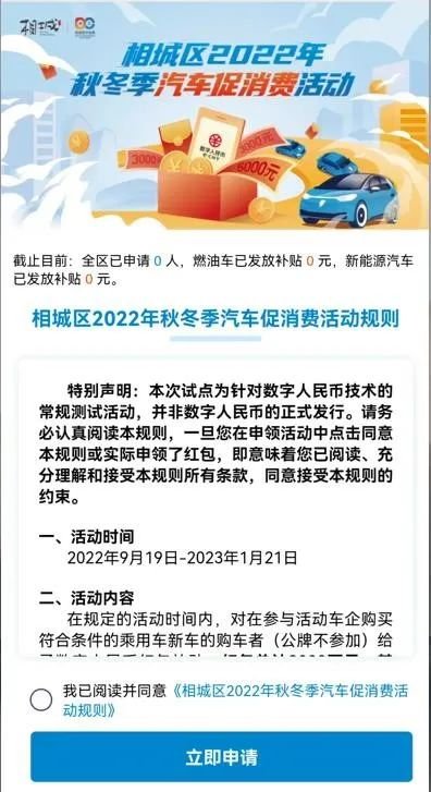 1.进入“相城区2022年秋冬季汽车促消费活动”活动首页,可浏览活动规则,并点击活动页面的“立即申请”按钮。