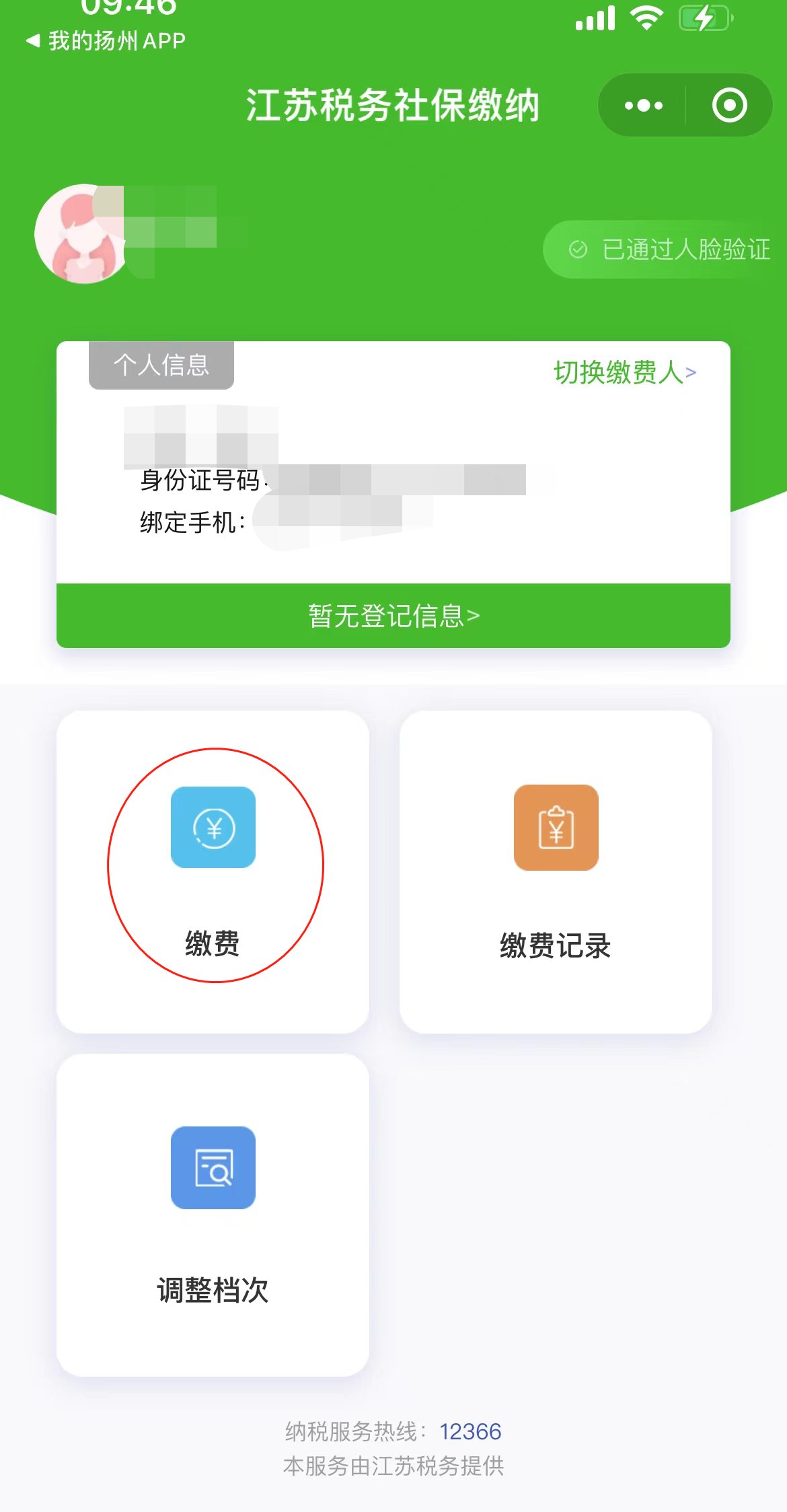 第四步:系统自动跳转至“江苏税务社保缴纳”微信小程序,请仔细核对缴费人员信息,完成缴费步骤。也可通过此方式为他人进行缴费。