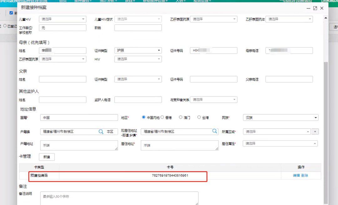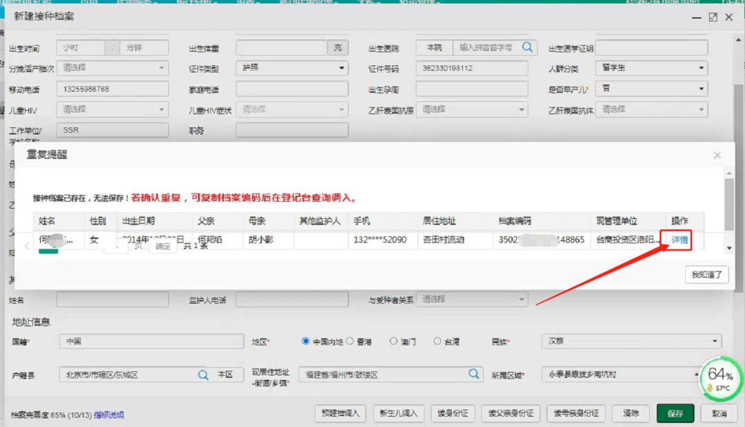 若为新的自助建档生成的预建档案,存在重卡的话(姓名+性别+出生日期+父亲/母亲信息重复才会判断重复,若有身份证,身份证信息是绝对重复项),会提示有重复,可点击【详情】查看,然后返回登记台【高级搜索】界面直接查询档案,核实后进行登记接种