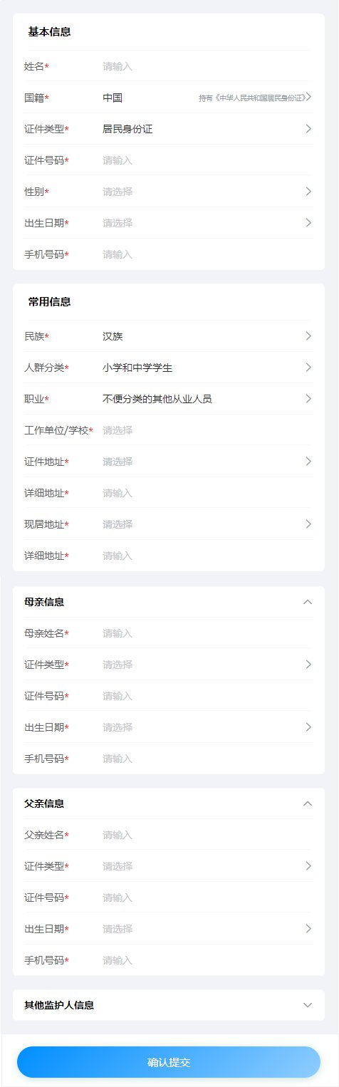 注:母亲、父亲、其他监护人必选其一填写,可多填个;母亲/父亲/其他监护人的选项中,有任一或多个字段有填写信息,则该母亲/父亲/其他监护人的所有信息必填