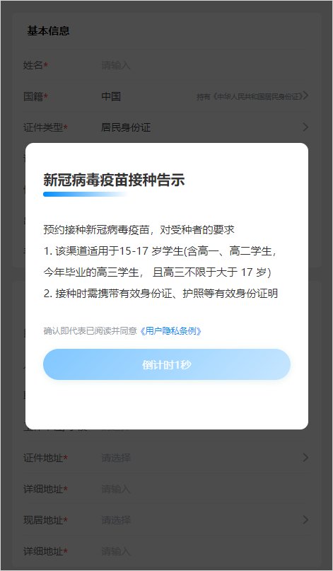 (1)点击后,进入信息填写页面,需确信新冠接种告示