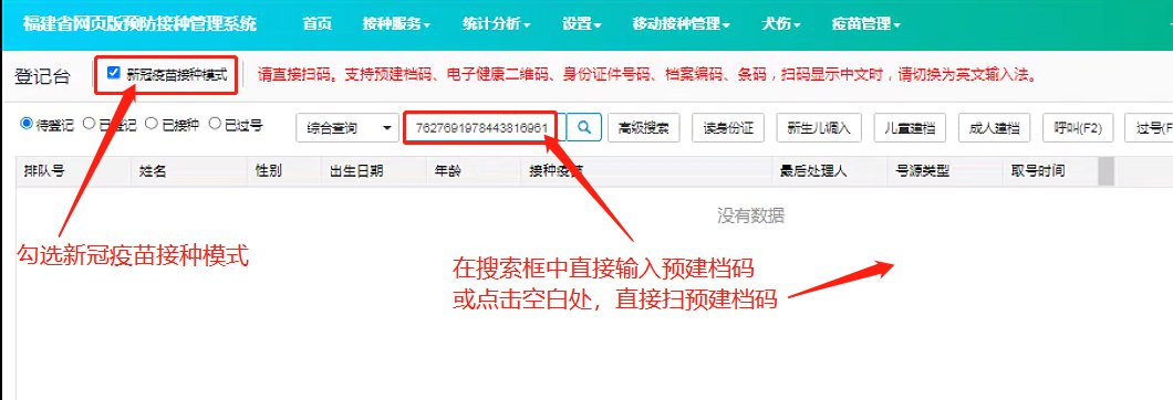 门诊登陆网页版系统后,登陆登记台——勾选【新冠疫苗接种模式】,即可在搜索框内直接输入预建档码进行查询,或者有扫码枪可以直接点击空白处扫预建档码