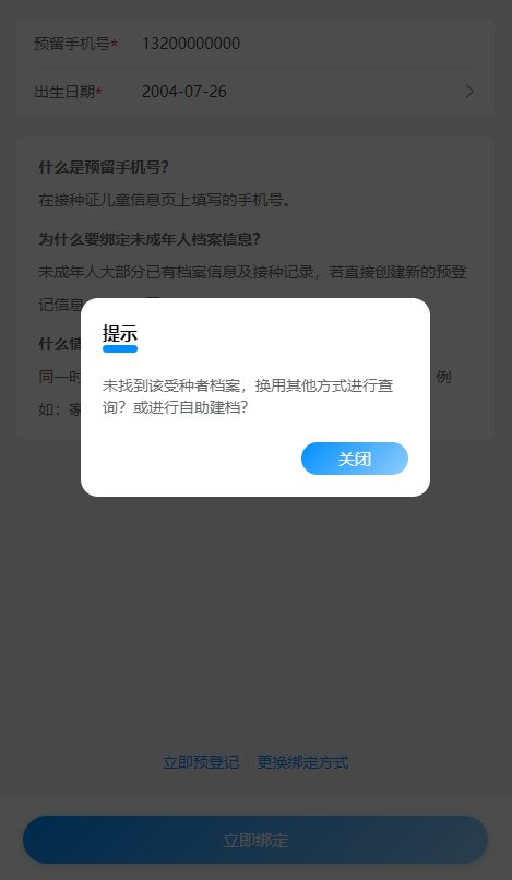 匹配失败:弹窗提示未找到该受种者信息,建议更换其他查询方式或自主建档。均可通过页面下方“立即预登记”、“更换绑定方式”操作
