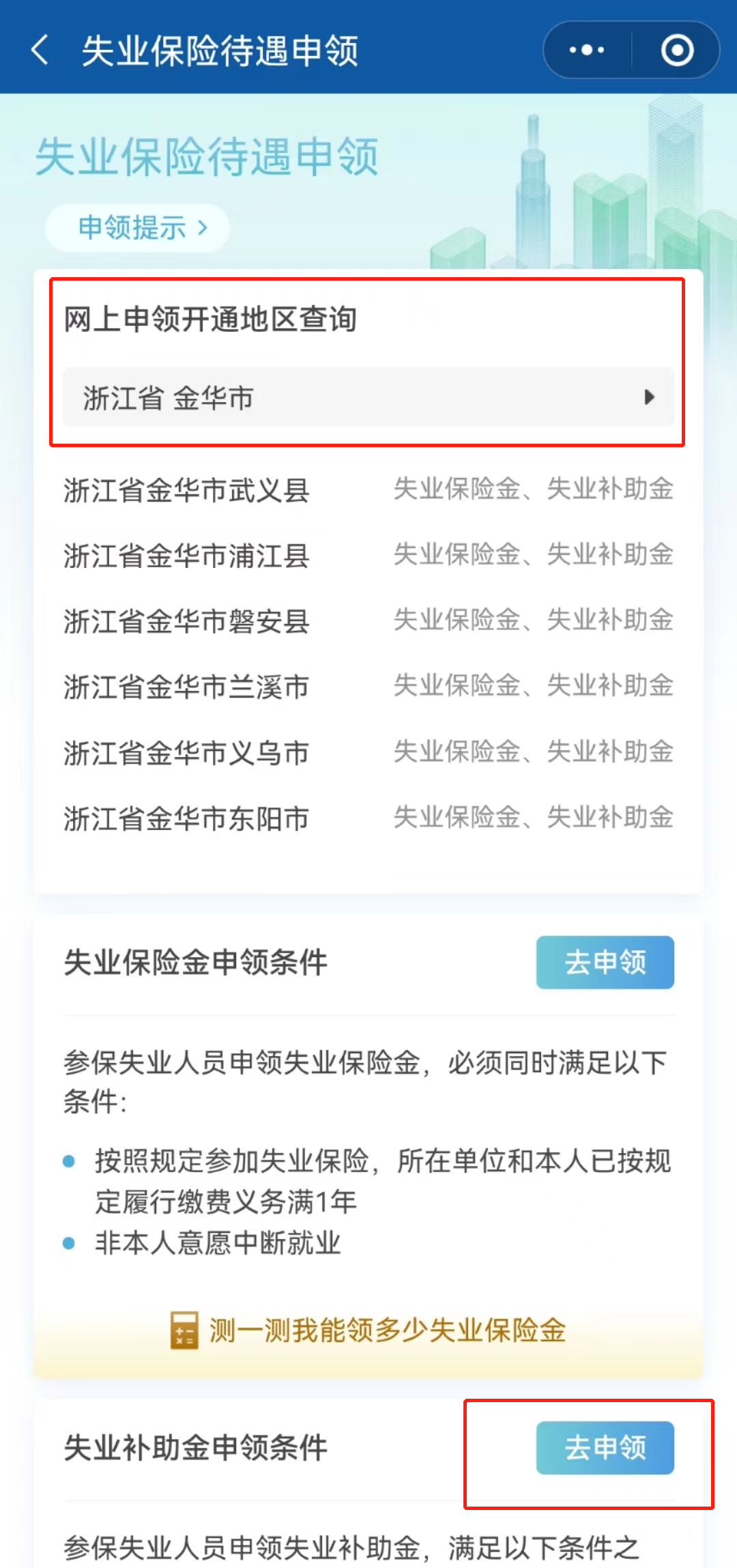 2、点击失业保险待遇申领,查询所申领参保地是否开通失业保险金或失业补助金网上申领服务。目前全国所有省(区、市)失业保险金和失业补助金均已开通统一申领服务。
