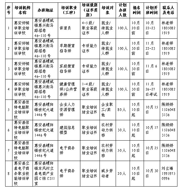 惠安县2022年10月职业技能培训班计划表如下: