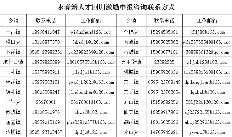 ①符合条件的永春籍高校毕业生于10月10日前,将申报材料扫描或拍照(需清晰)打包发送至所属乡镇邮箱,由乡镇统一汇总报送县委人才办(注:10月10日以后符合条件的,可先与所在乡镇联系后申报);