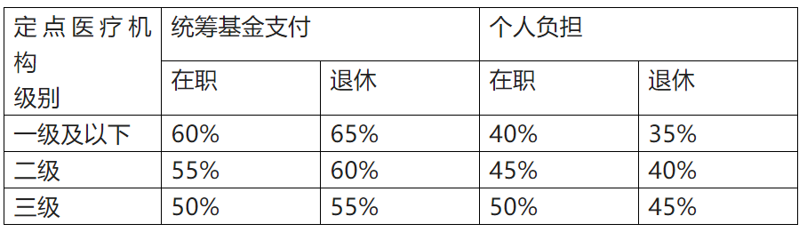 3、支付比例。在一个参保年度内,参保人员在门诊就医发生的属于基本医疗保险支付范围的医疗费用,在统筹基金起付标准以上、支付限额以下的,由统筹基金和个人按下列比例分别负担: