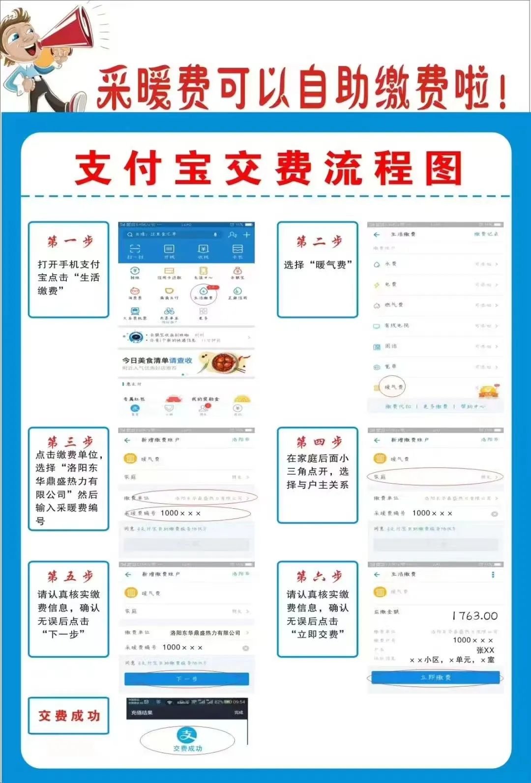 进入支付宝主页→选择点击生活缴费→选择暖气费→选择洛阳东华鼎盛热力有限公司(手机定位一定选择洛阳市否则你找不到洛阳东华鼎盛热力有限公司)→输入10位户号→设置分组选输入“我家或选择填写各自小区名称”→勾选《支付宝生活缴费协议》→确认支付。