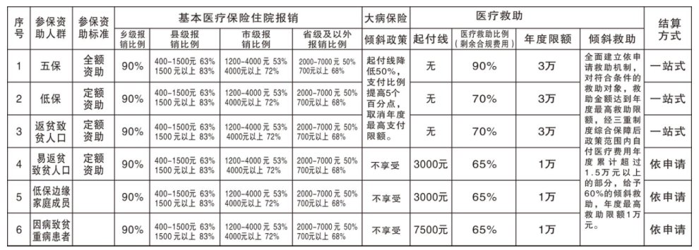 在全面落实普惠待遇政策基础上,对特困人员、低保对象、返贫致贫人口住院政策范围内医疗费用实行大病保险起付线降低50%、支付比例提高5个百分点、取消年度最高支付限额等倾斜保障政策。