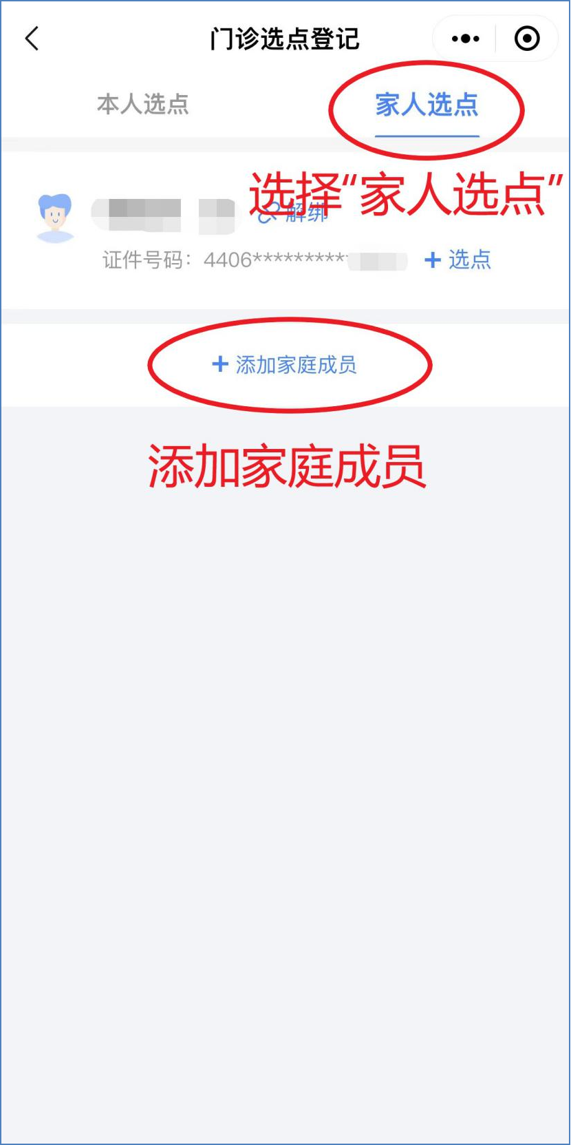 进入“家人选点”页面,点击“添加家庭成员”,最多绑定可8位家人。按提示输入信息,点击“保存”。回到“家人选点”界面点击“选点”,按照选点流程操作即可。