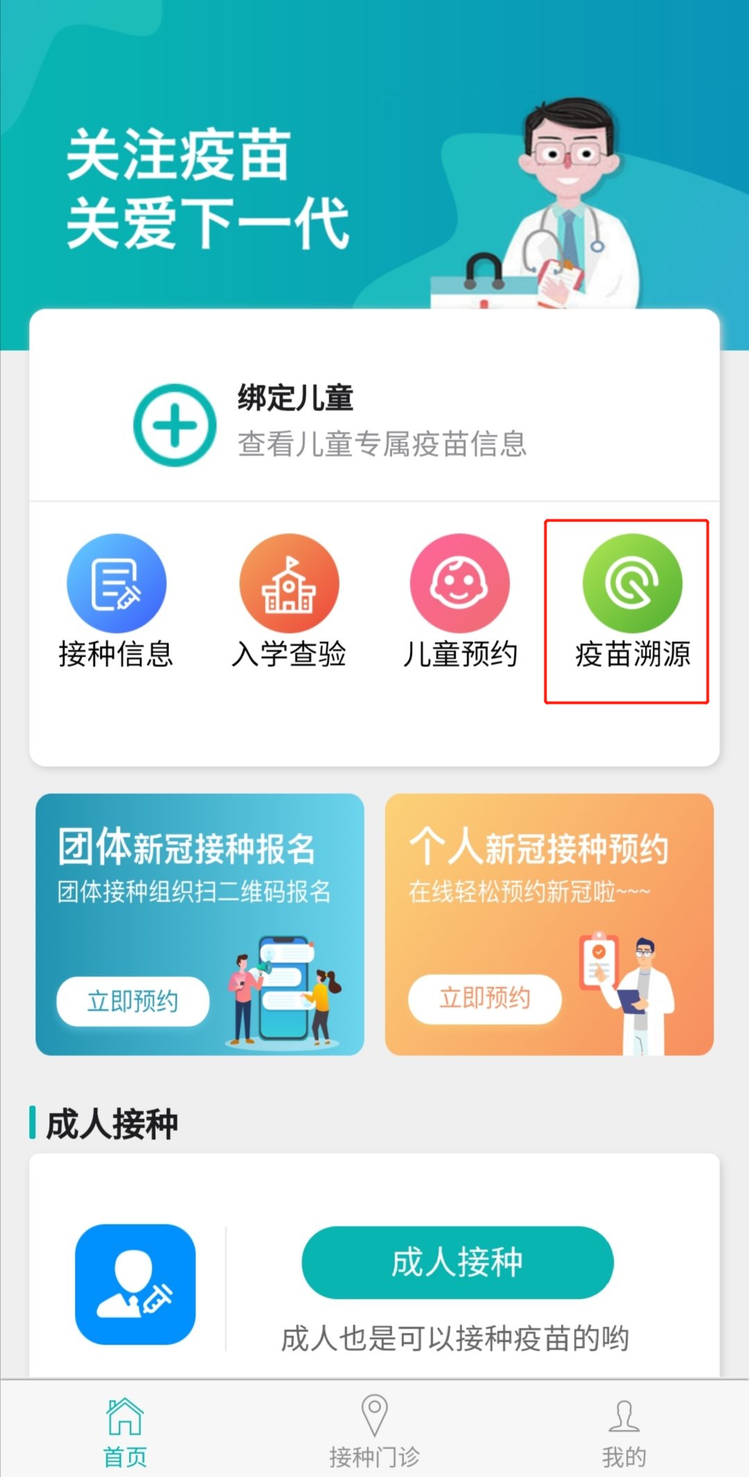 第二步:选择“首页”--“疫苗溯源”;