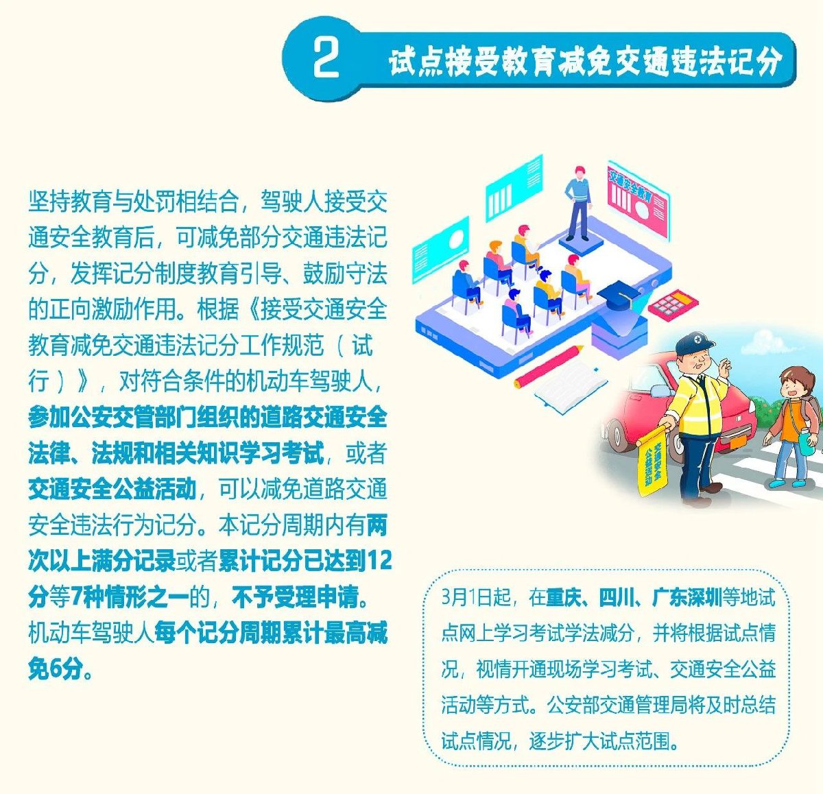 3月1日起,在重庆、四川、广东深圳等地试点网上学习考试学法减分,并将根据试点情况,视情开通现场学习考试、交通安全公益活动等方式。公安部交通管理局将及时总结试点情况,逐步扩大试点范围。