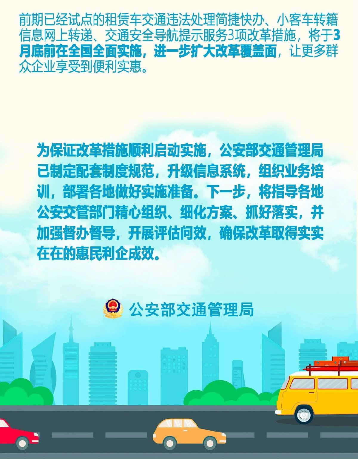 另外,前期已经试点的租赁车交通违法处理简捷快办、小客车转籍信息网上转递、交通安全导航提示服务3项改革措施,将于3月底前在全国全面实施,进一步扩大改革覆盖面,让更多群众企业享受到便利实惠。