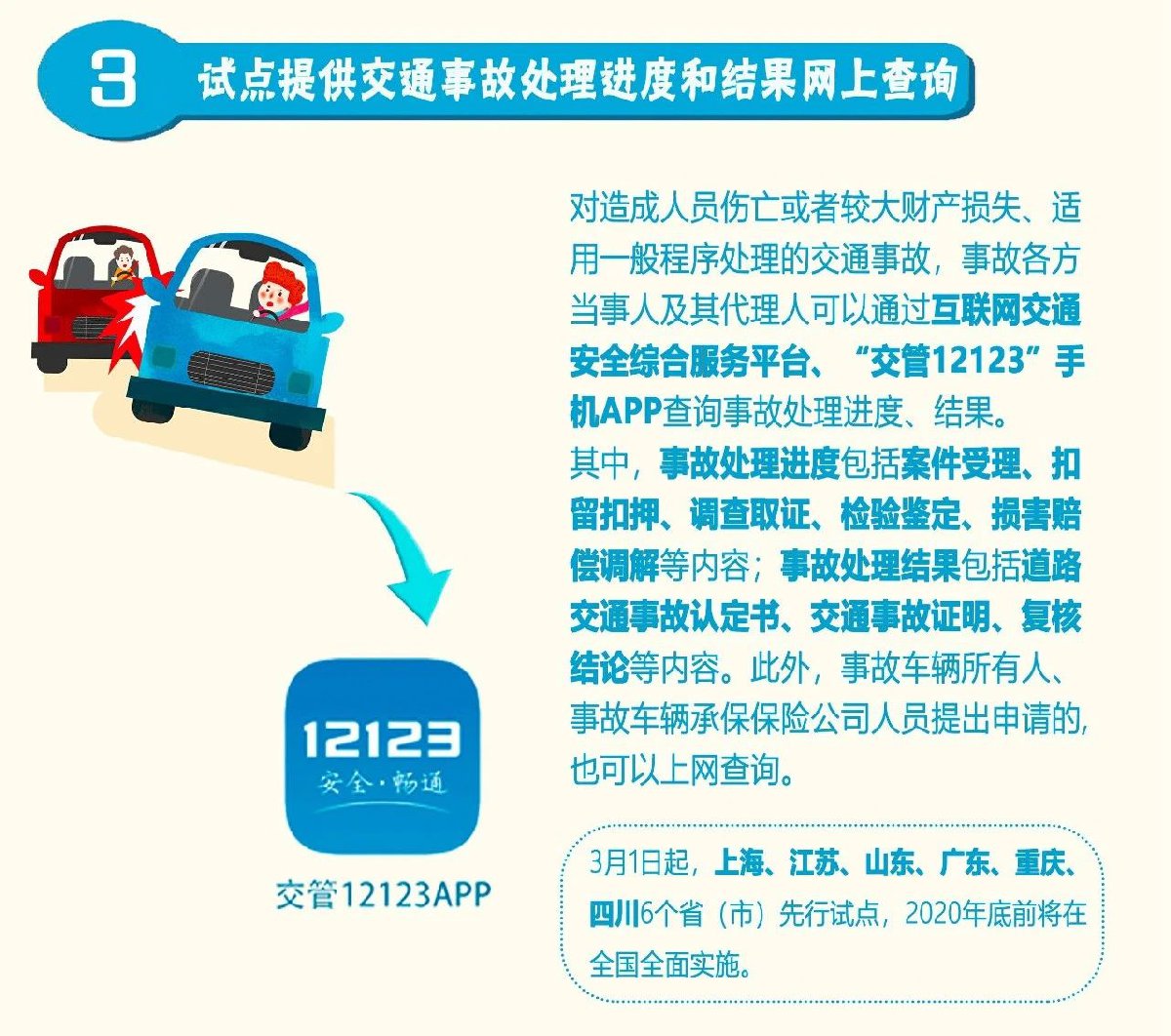 (三)试点提供交通事故处理进度和结果网上查询,进一步保证公开透明。