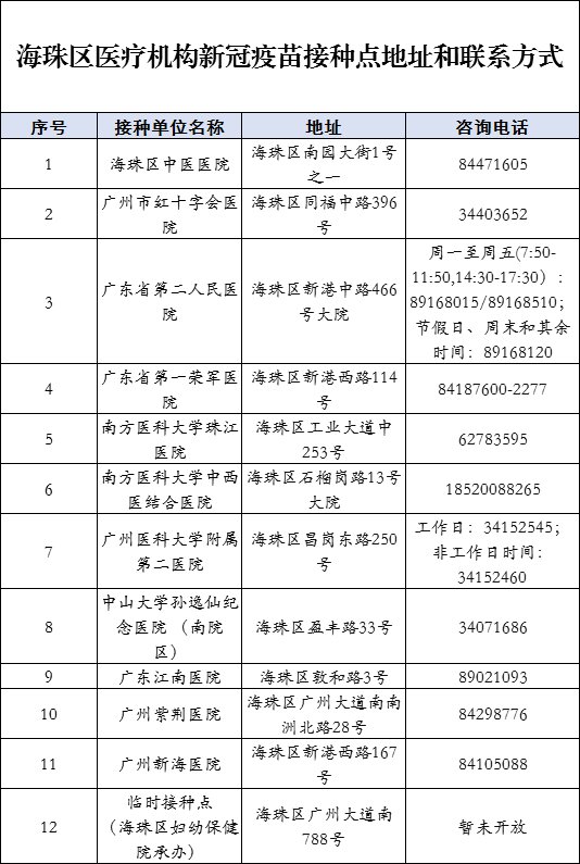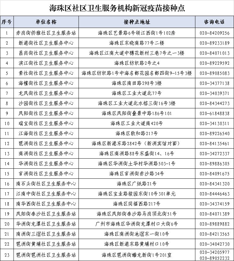 海珠区设立35个新冠疫苗接种点,接种点地址、联系电话详见下图。