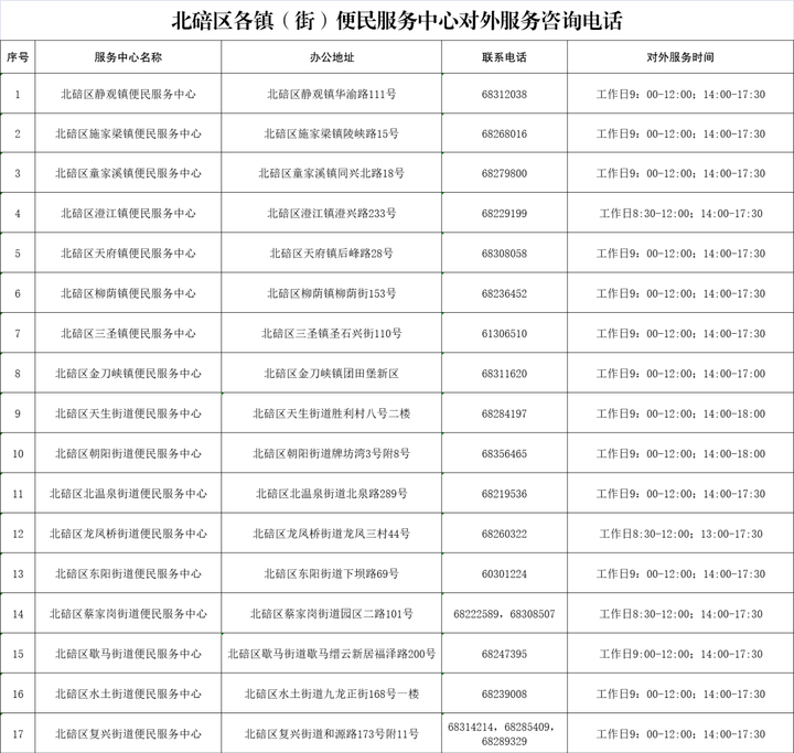 附件2:北碚区各镇(街)便民服务中心对外服务咨询电话(点此查看)