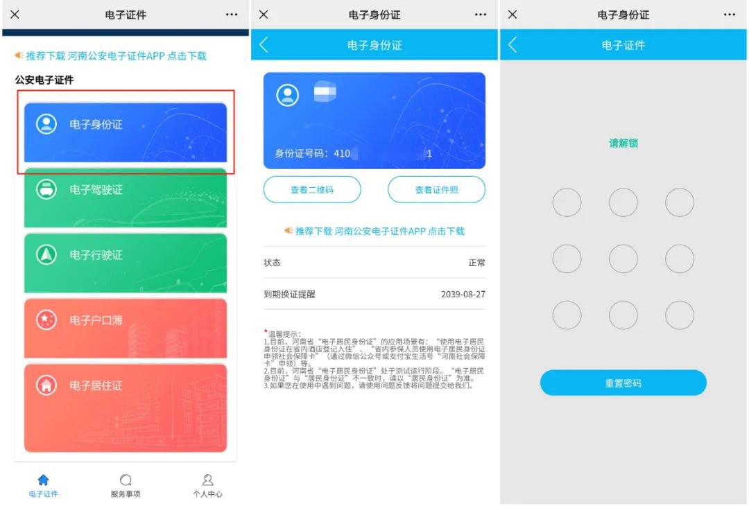 提醒:目前电子身份证仅支持河南省内户籍人员,后期将依托公安电子证照跨省互认工作,逐步会新增其他省份户籍人员。