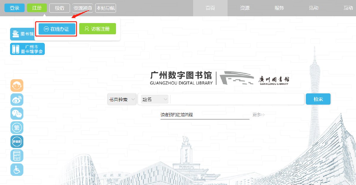 可登录网址:http://www.gzlib.org.cn(广州图书馆官方网站),进入广州数字图书馆首页,点击左上角“注册”按钮,选“在线办证”后, 18岁以上广州社保卡持卡人可通过社保卡信息进行验证注册,并实时开通基本借阅功能及数字图书馆阅读功能。