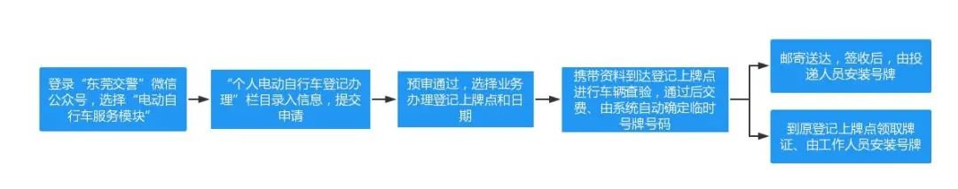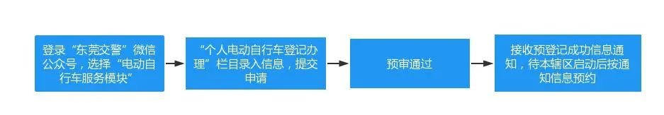 东莞电动自行车登记上牌流程:申请前请备齐有效的居民身份证或临时居民身份证(非东莞户籍还需提供居住证或居住证受理回执)、车辆合格证、购车发票、电动自行车左前方45度角及左后方45度角相片,可依法申请登记。电动自行车登记上牌实行预约办理模式。操作流程如下: