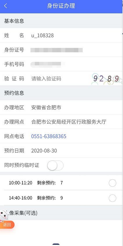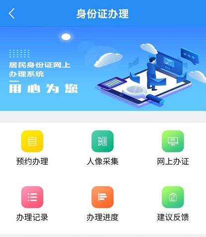 3.进行人脸验证后进入身份证办理页面,可在线进行预约办理、人像采集、在线缴费、查询办理进度等业务。