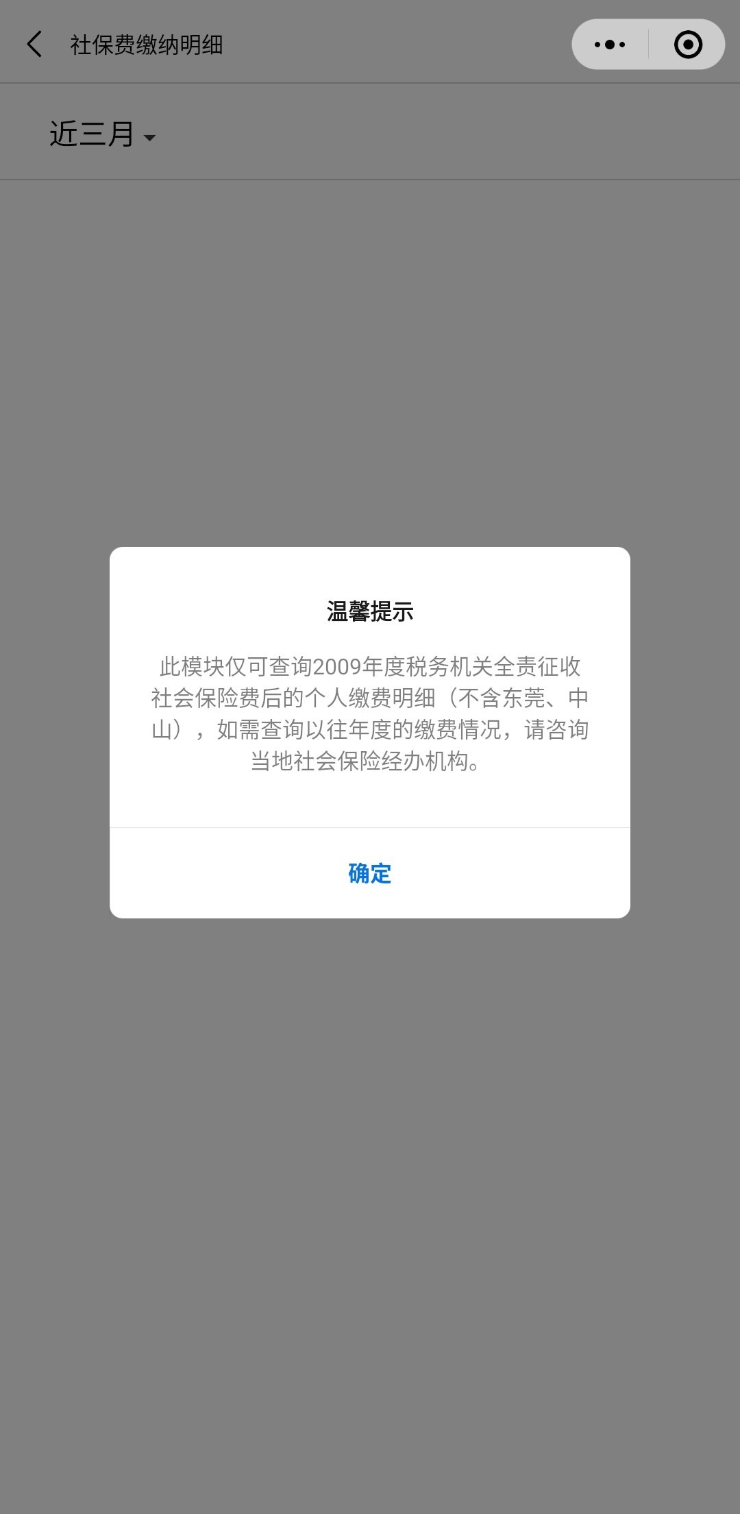 此模块仅可查询2009年度税务机关全责征收社会保险费后的个人缴费明细(不含东莞、中山),如需查询以往年度的缴费情况,请咨询当地社会保险经办机构。