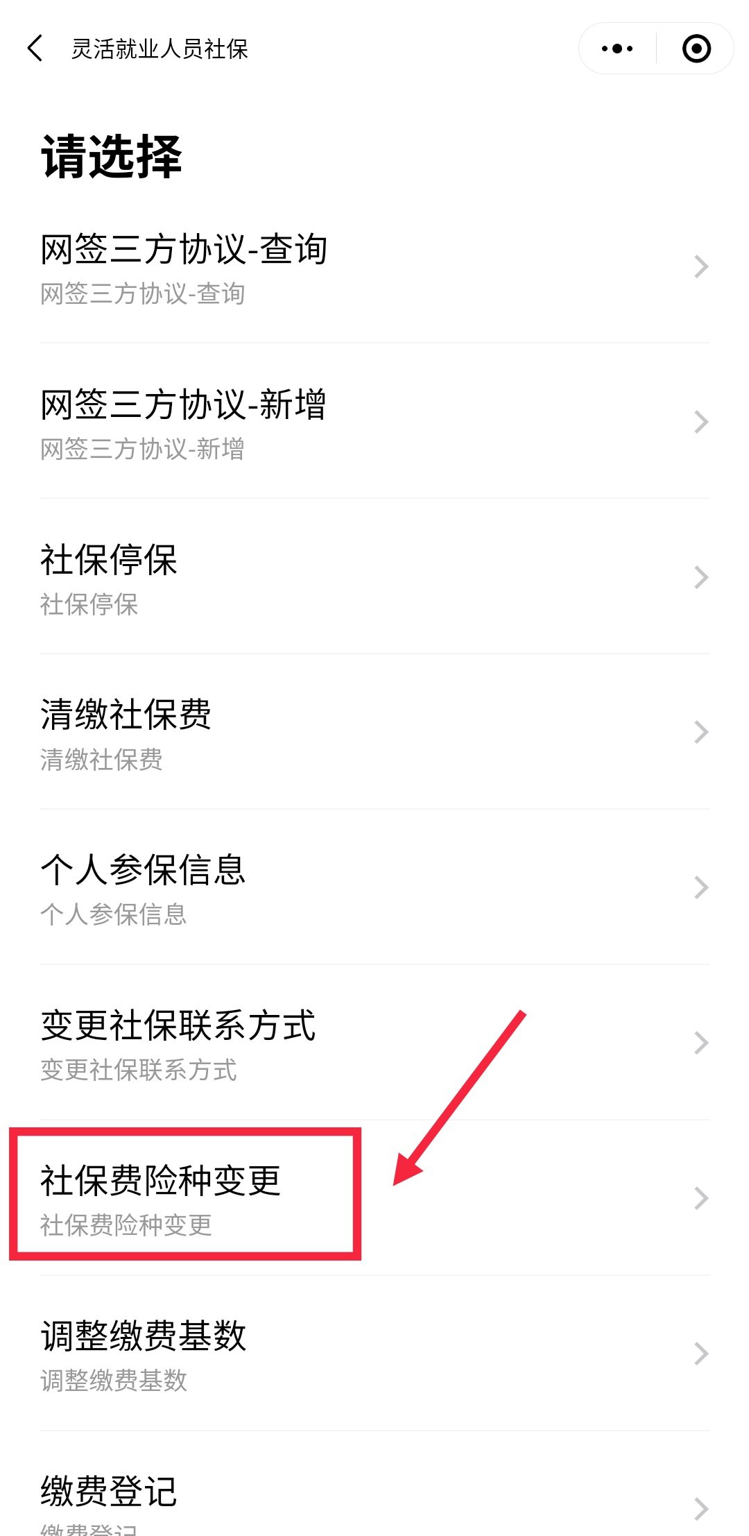 第三步:在页面中找到并点击【社保费险种变更】,如下图所示;