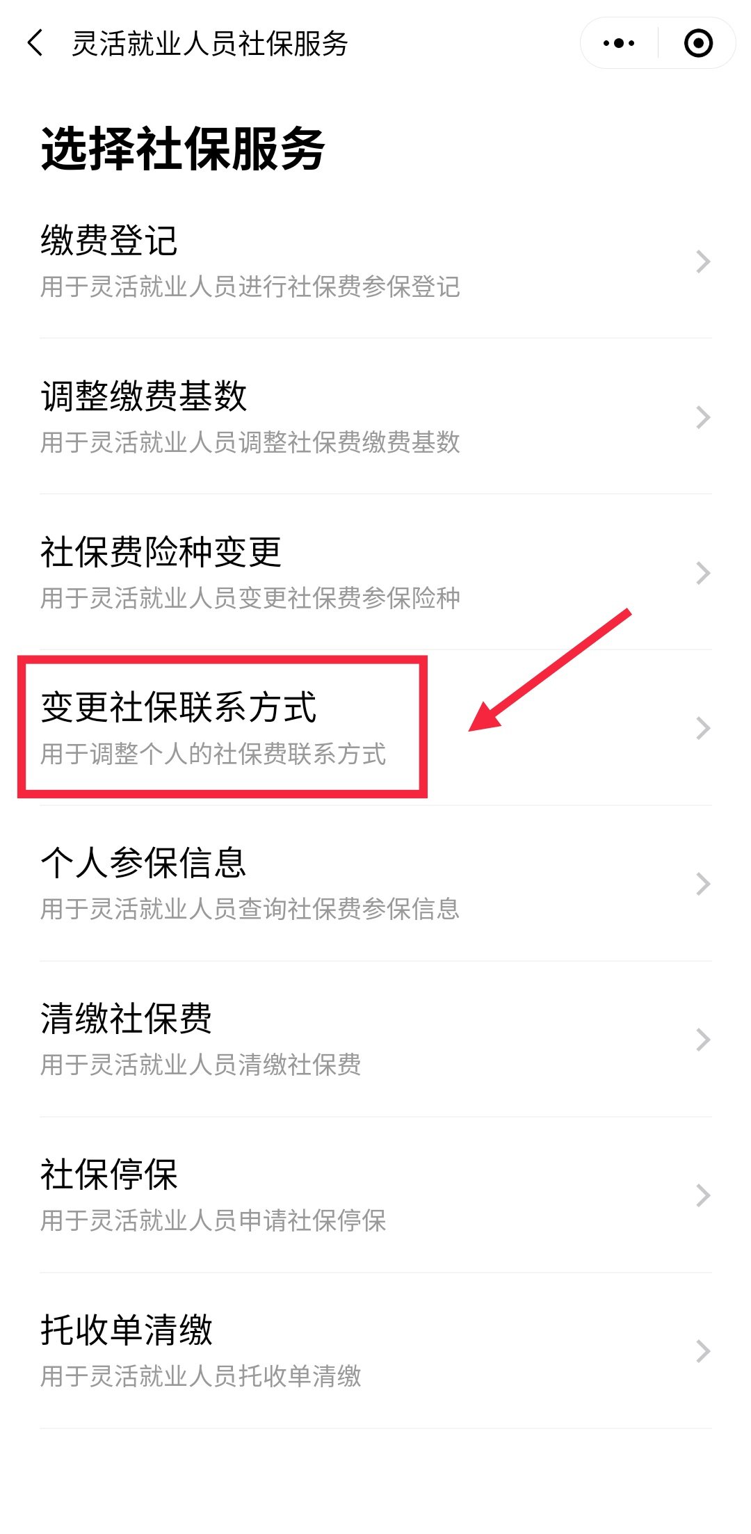 第四步:在页面中找到并点击【变更社保联系方式】,并按页面提示进行操作即可,如下图所示;