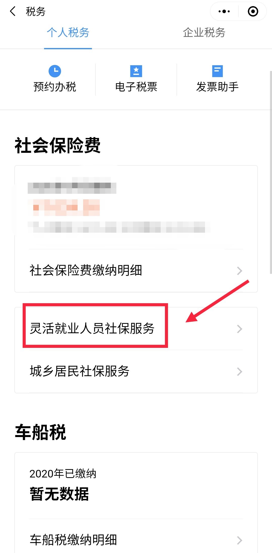 第三步:在【社会保险费】中找到并点击【灵活就业人员社保服务】,如下图所示;