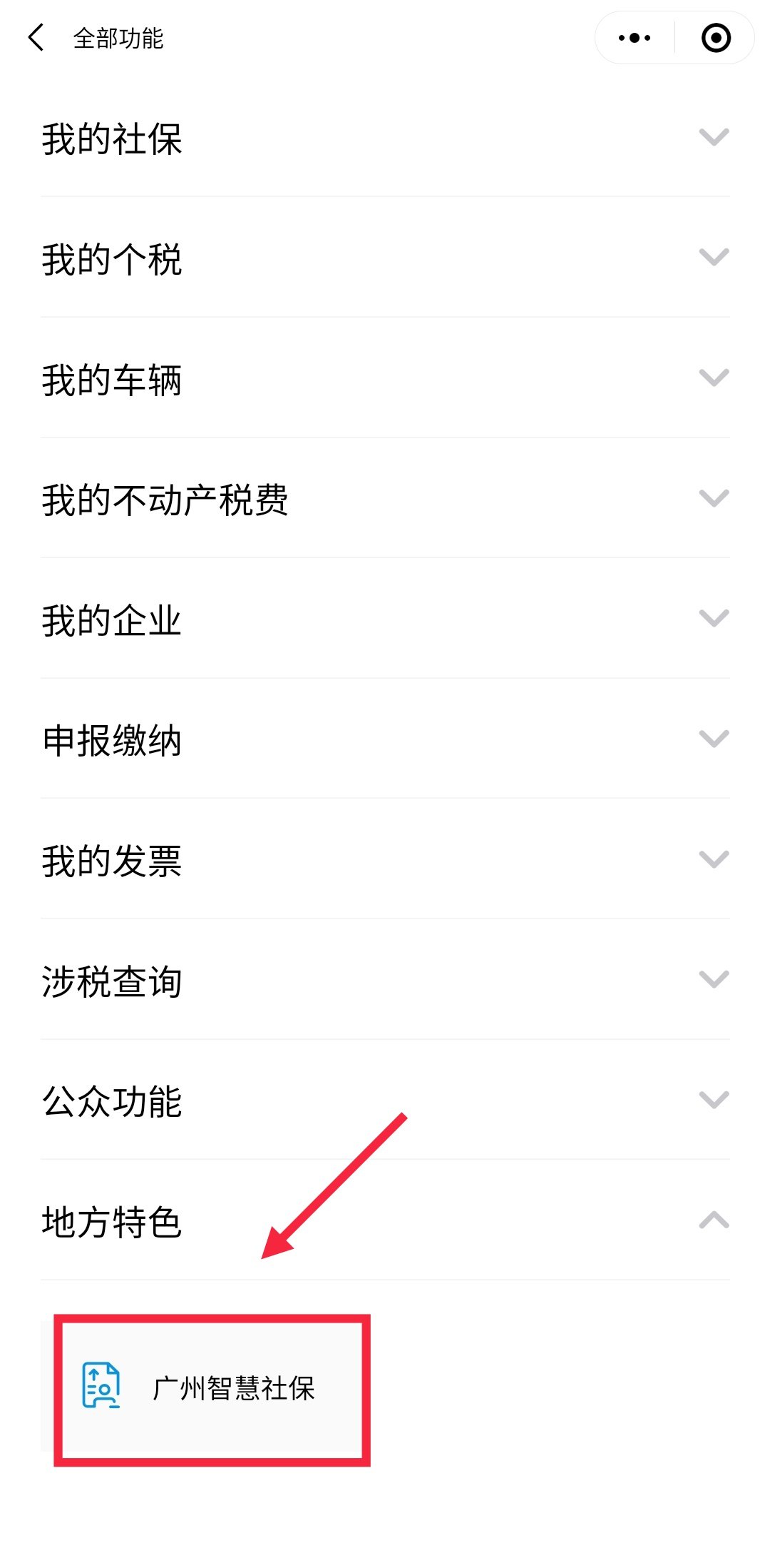 第三步:在页面中找到并点击【地方特色】--【广州智慧社保】,如下图所示;