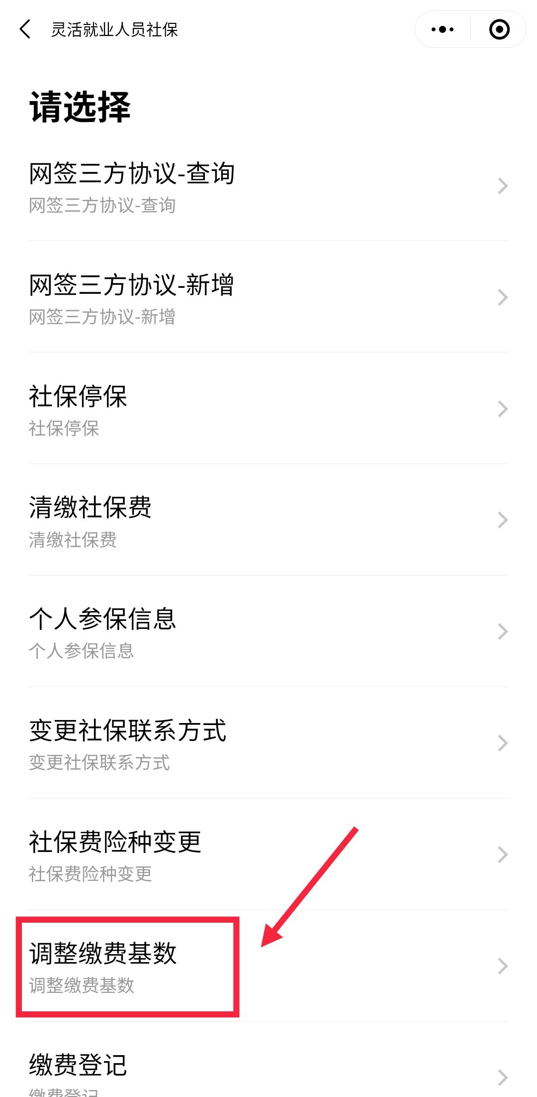 第三步:在页面中找到并点击【调整缴费基数】,如下图所示;
