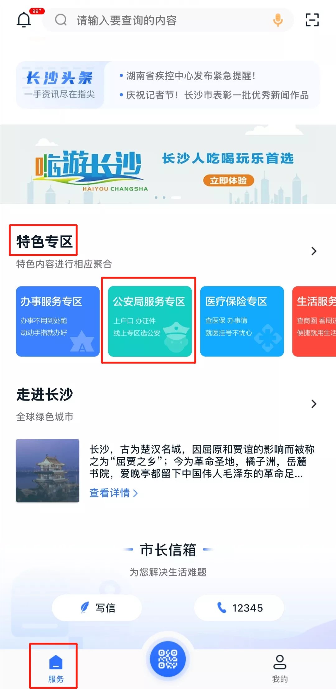 二、进入“我的长沙”APP,将首页下滑至【特色专区】,点击【公安服务专区】-更多服务,即可进入办理界面: