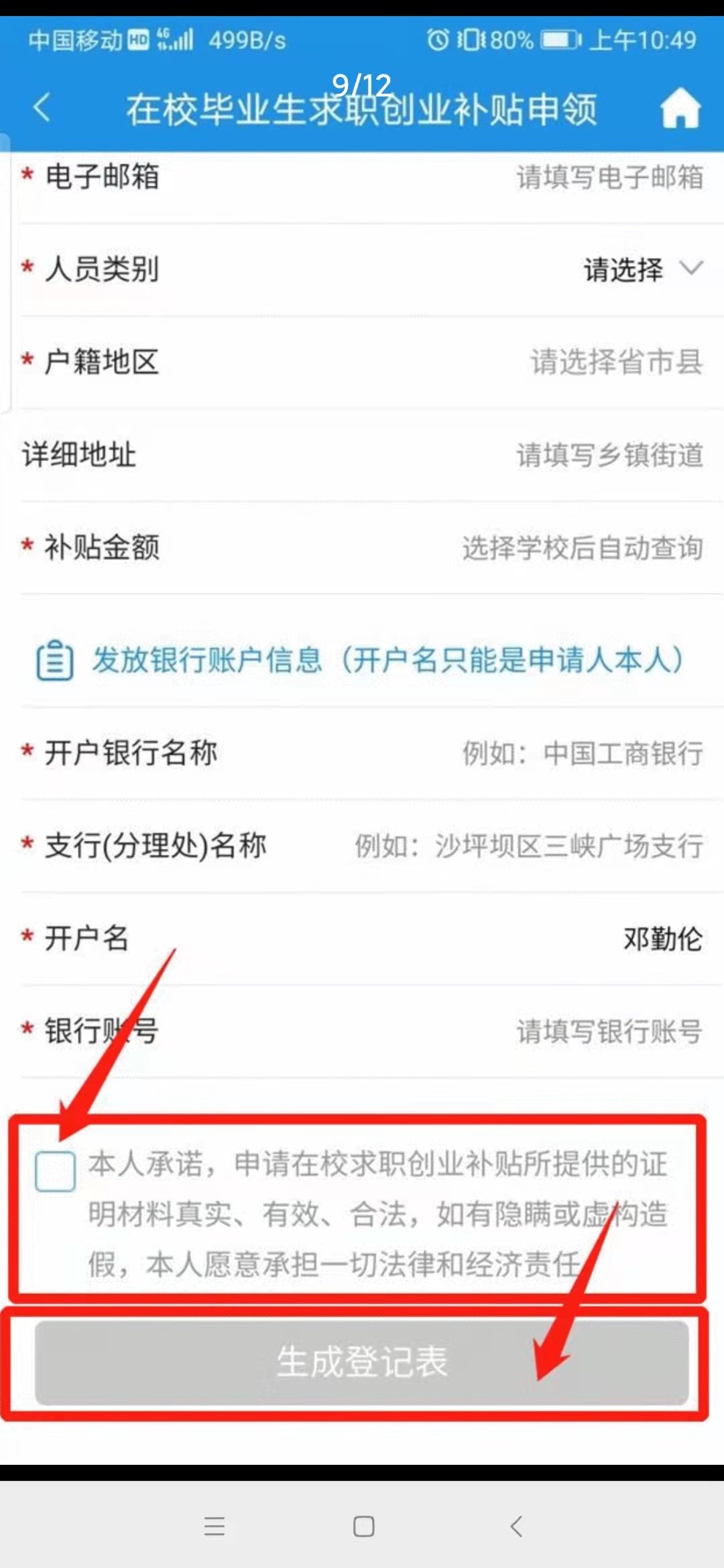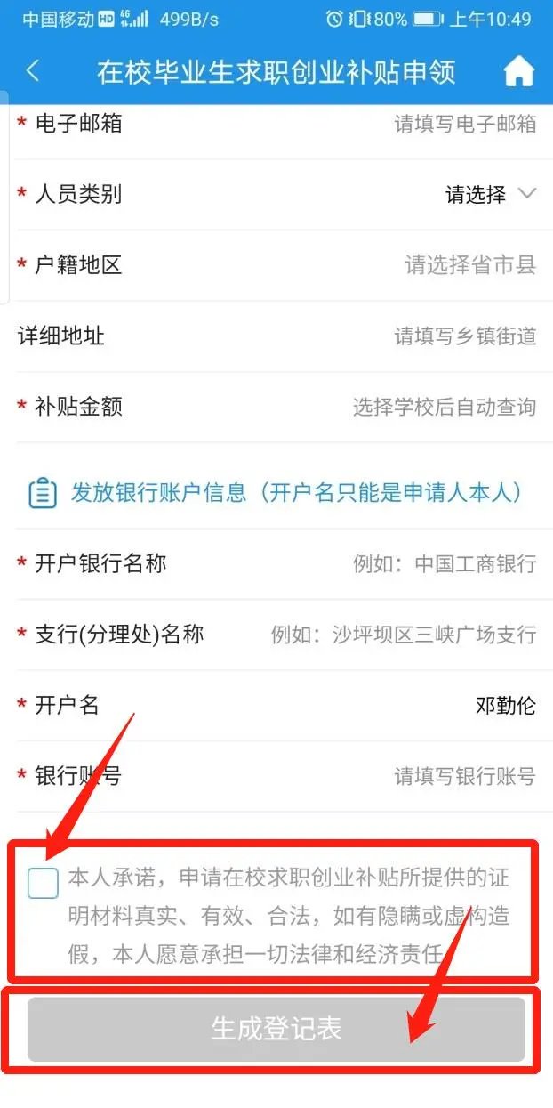 第④步:填写申请信息后,勾选承诺信息,点击【生成登记表】按钮,生成申请表。