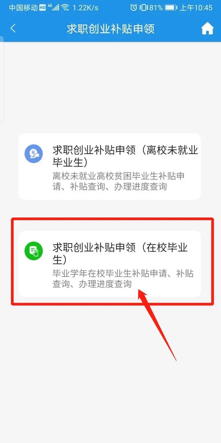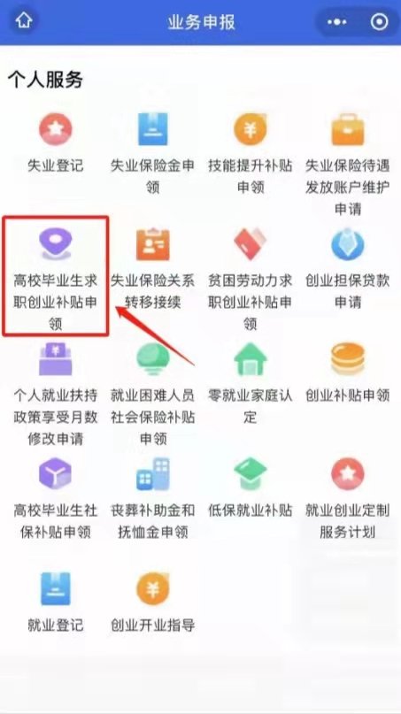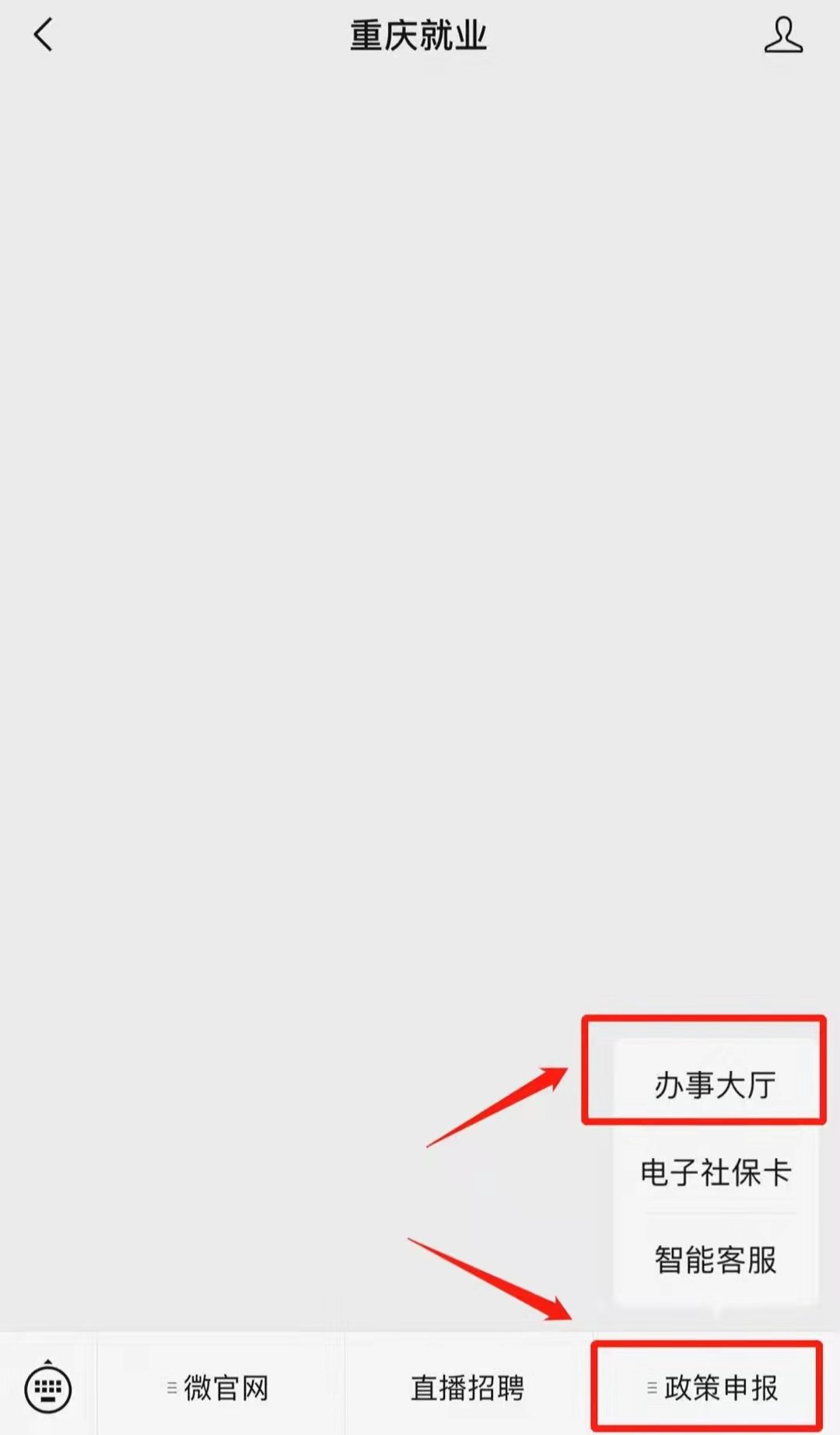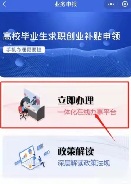 第①步:申请人进入“重庆就业”公众号,在菜单栏点击【政策申报】-【办事大厅】,进入重庆智能就业平台小程序,点击【高校毕业生求职创业补贴申领】,点击【立即办理】,进入补贴申领页面。