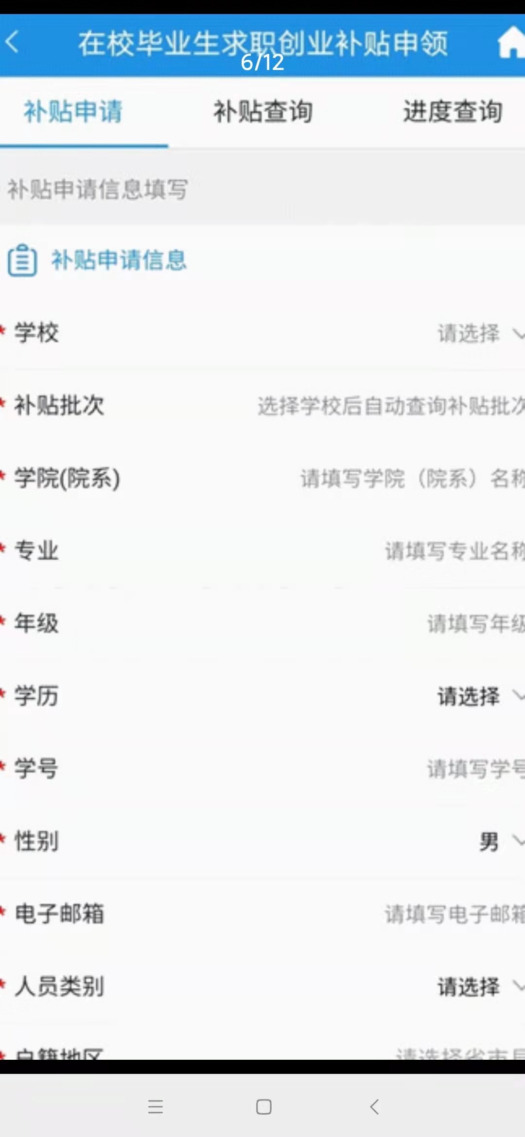 第②步:在补贴申领页面点击【求职创业补贴申领(在校毕业生)】事项选项卡,进入人员基础信息页面,页面根据当前登录通过重庆账号,默认显示人员基础信息。