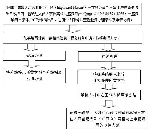 登录“成都人才公共服务平台-在线办事”-选择“集体户户籍卡借出”(http://s.rc114.com/),点击立即办理,提交业务申请,系统会根据您的具体情况给予针对性的业务指引提示(不办理也可获得引导)。